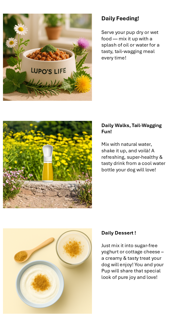 It can be easily mixed with your dog's food, whether dry food (simply mix with a little water or high-quality oil - e.g. linseed or salmon oil), wet food or BARF. Fun part: Mixed into yoghurt, as ice-cream or mixed with water (water-bottle for your daily walk) - your dog will love it !